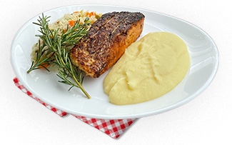 Salmão Chileno Grelhado servido com Arroz à Grega e Purê de Batatas.